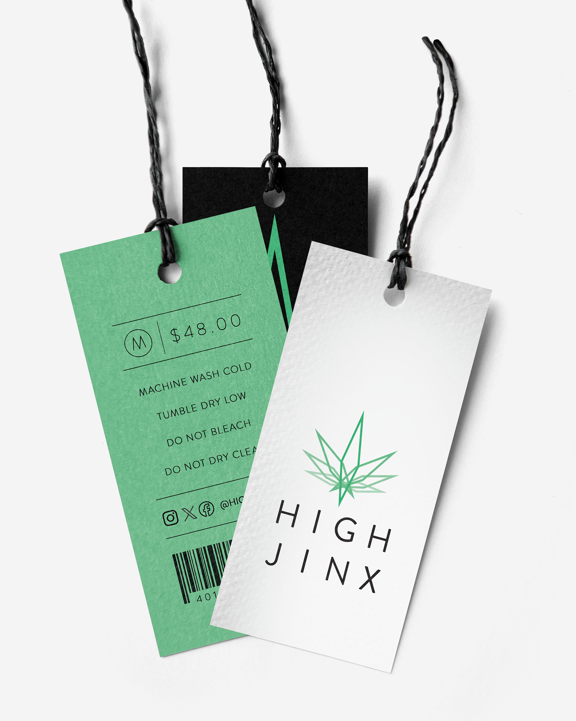 Brand identity for HighJinx, an urban and 420-inspired clothing line by Dreamgirl International. Project encompasses full logo suite, packaging, website, graphic tees and trimmings.