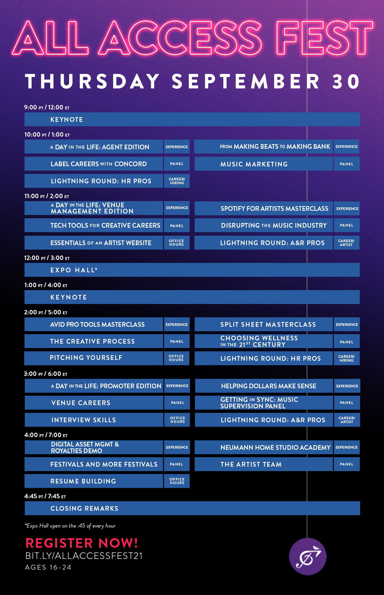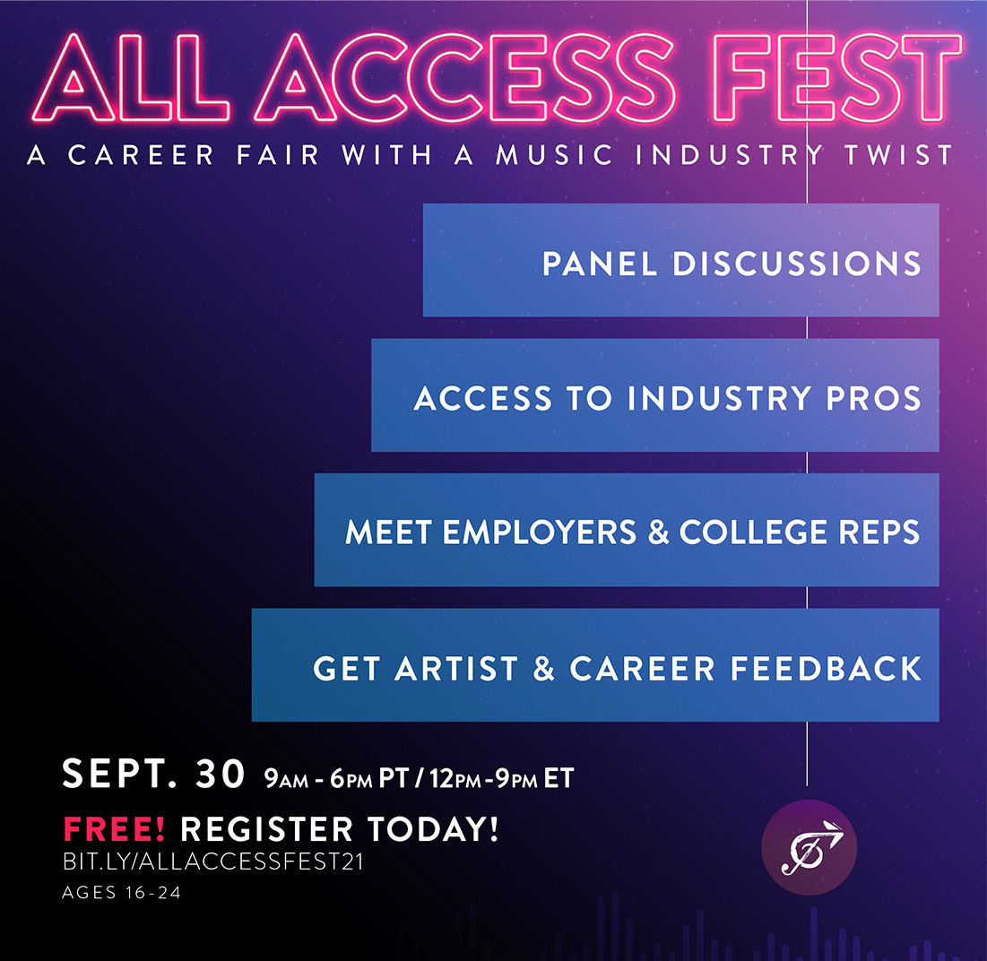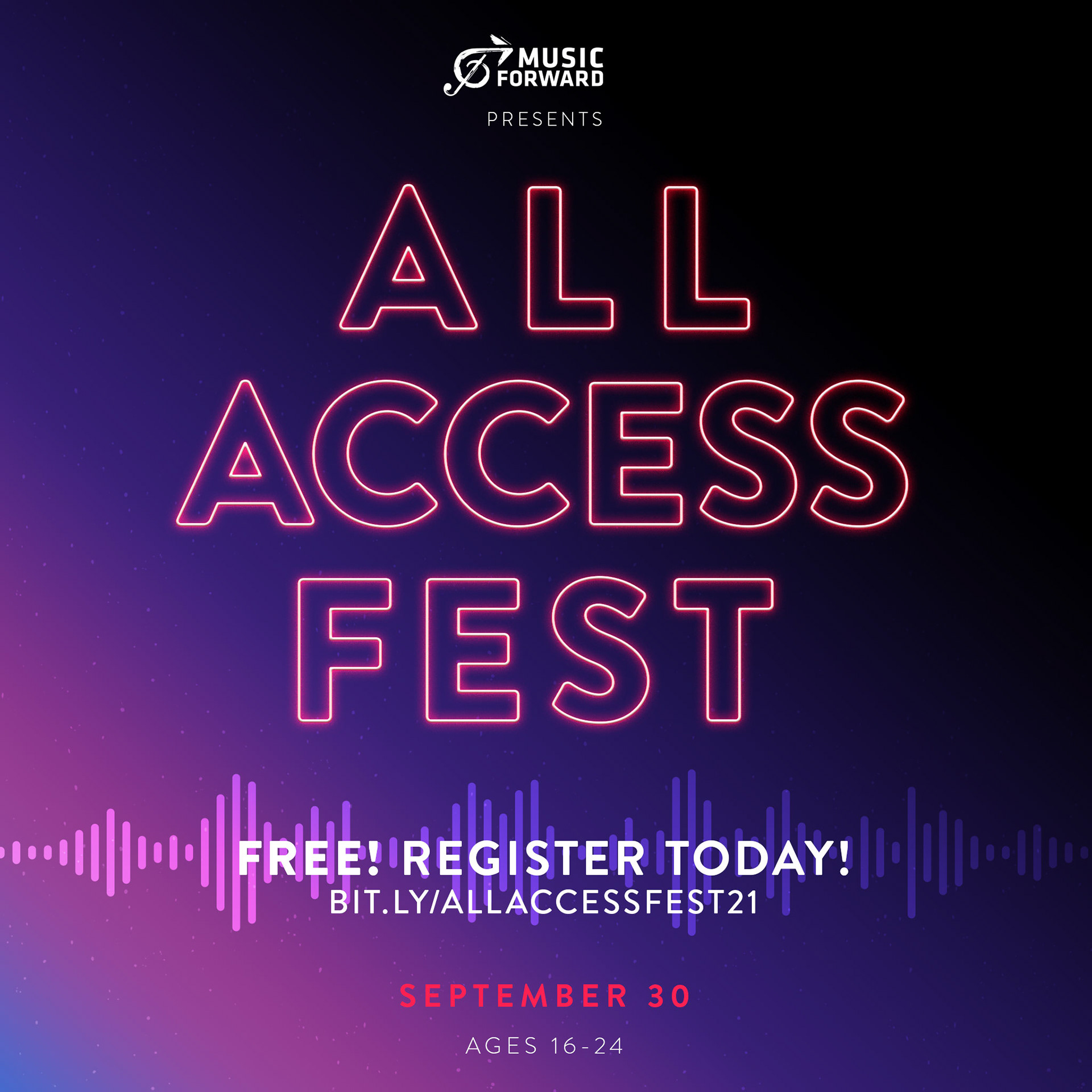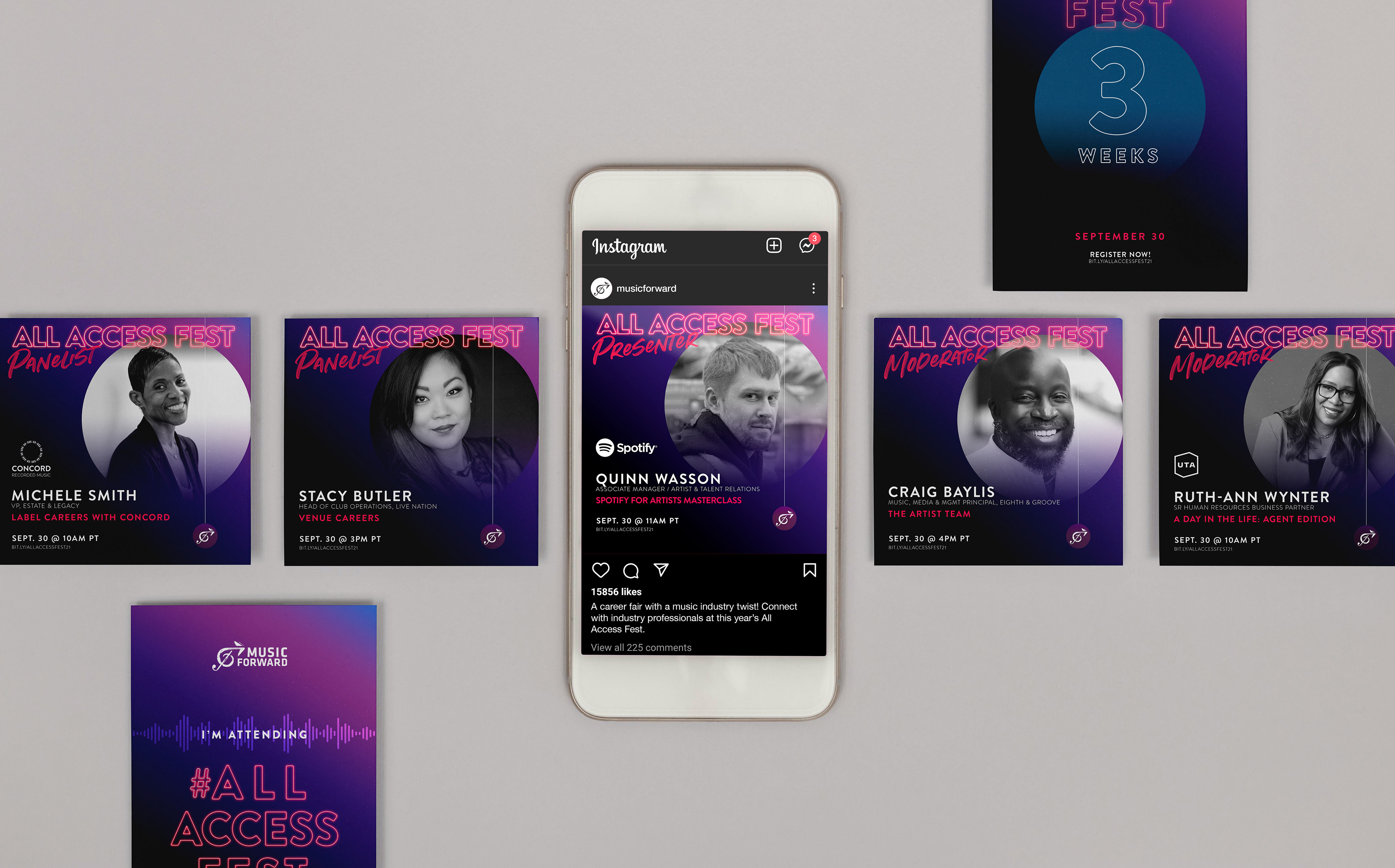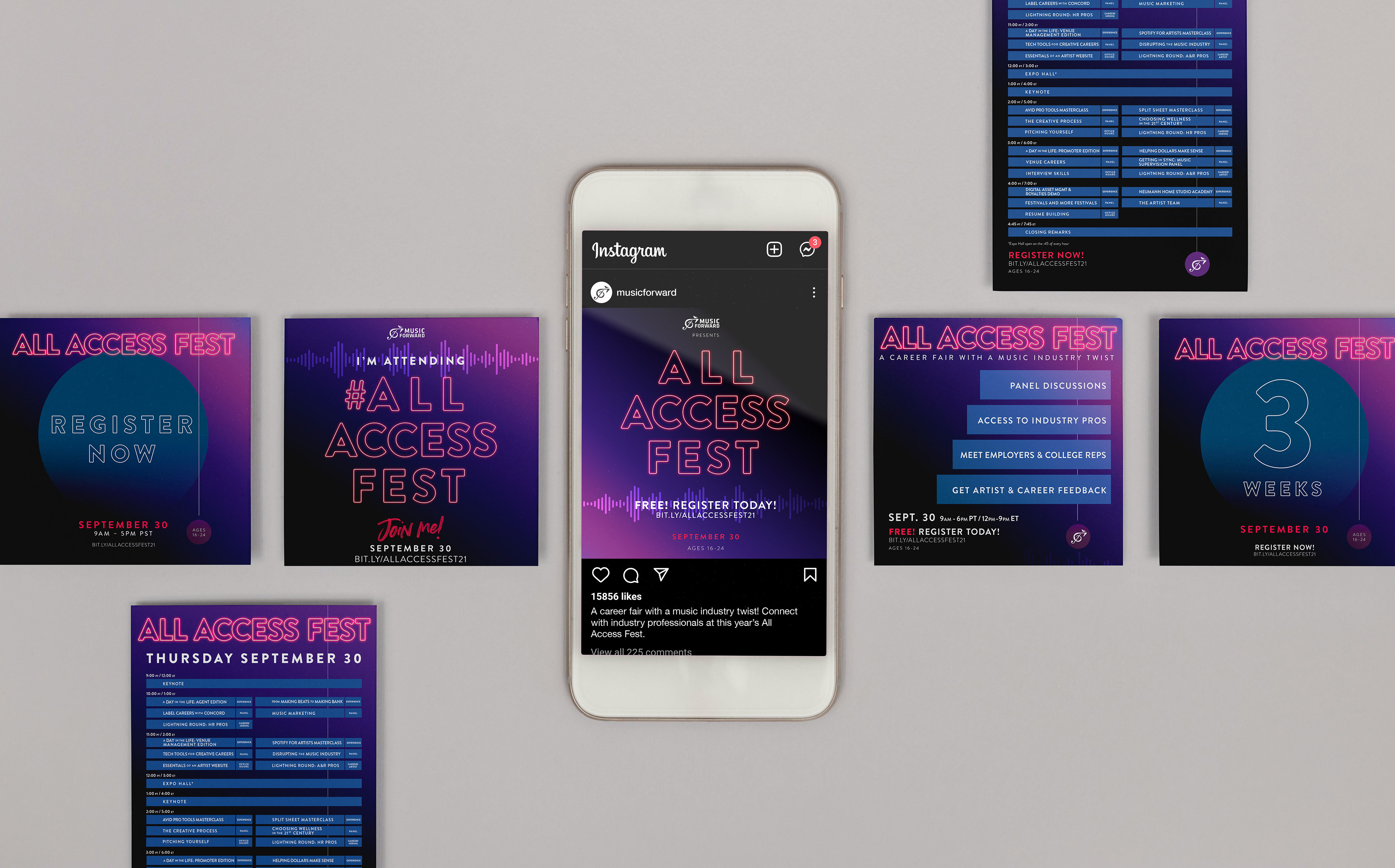 Social + email graphics for All Access Fest, a career fair with a music industry twist produced by Music Forward Foundation.