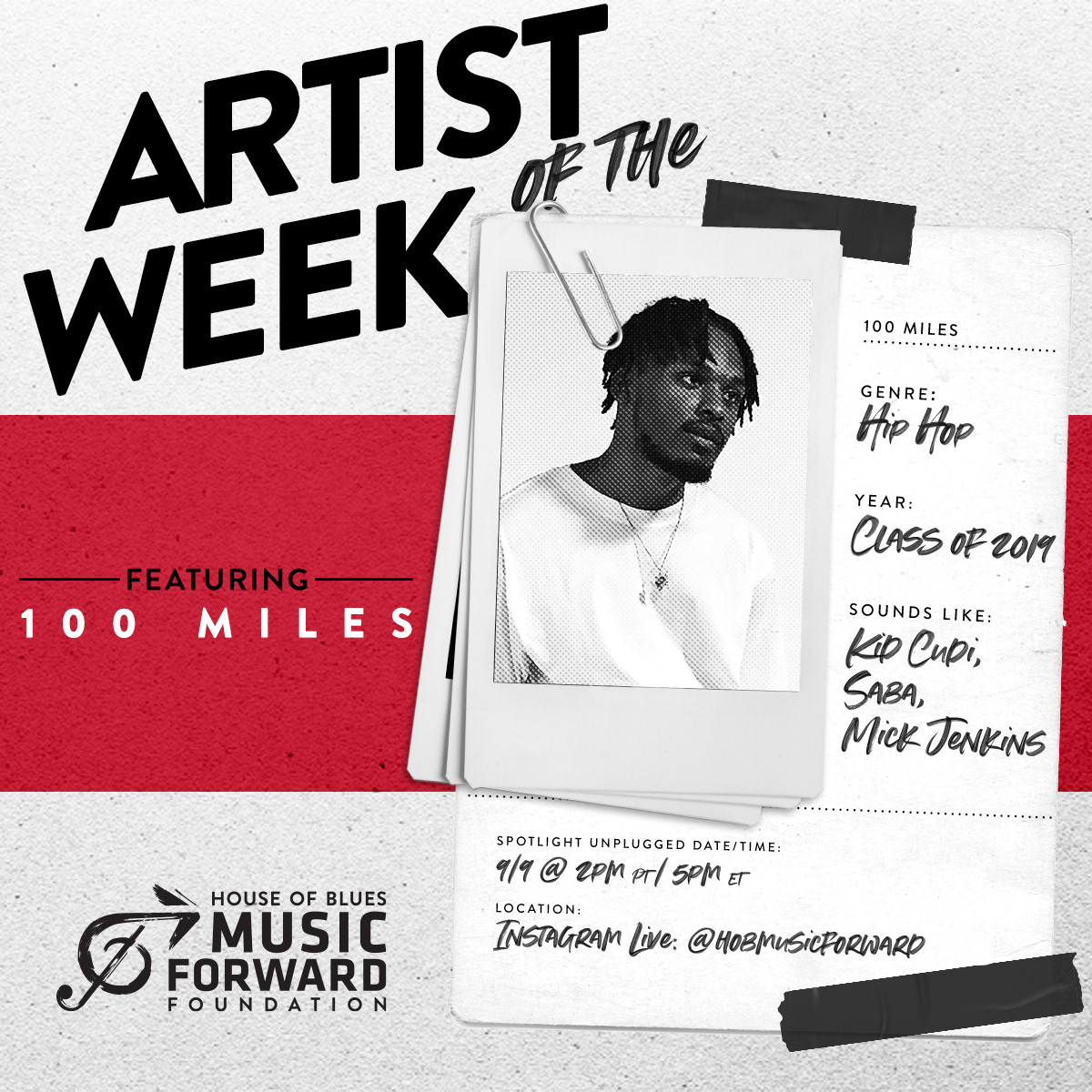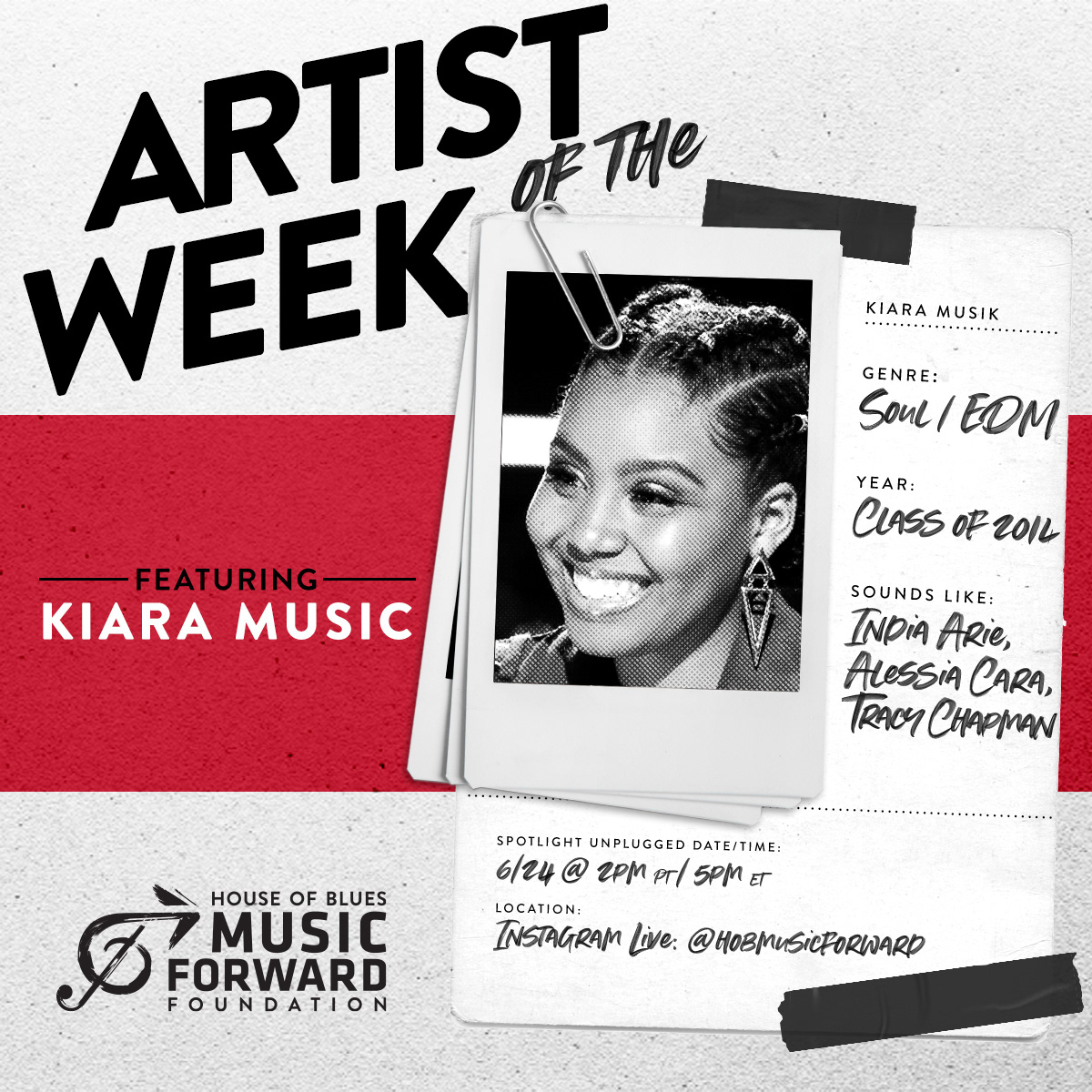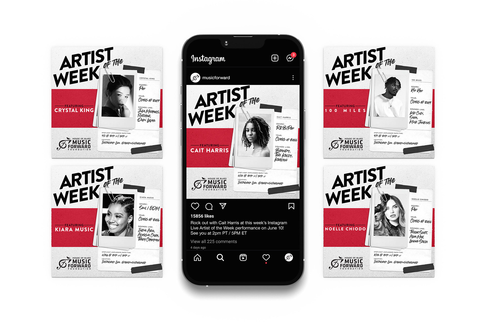 Social graphic template design for nonprofit House of Blues Music Forward Foundation's Artist of the Week program, highlighting up and coming youth artists.