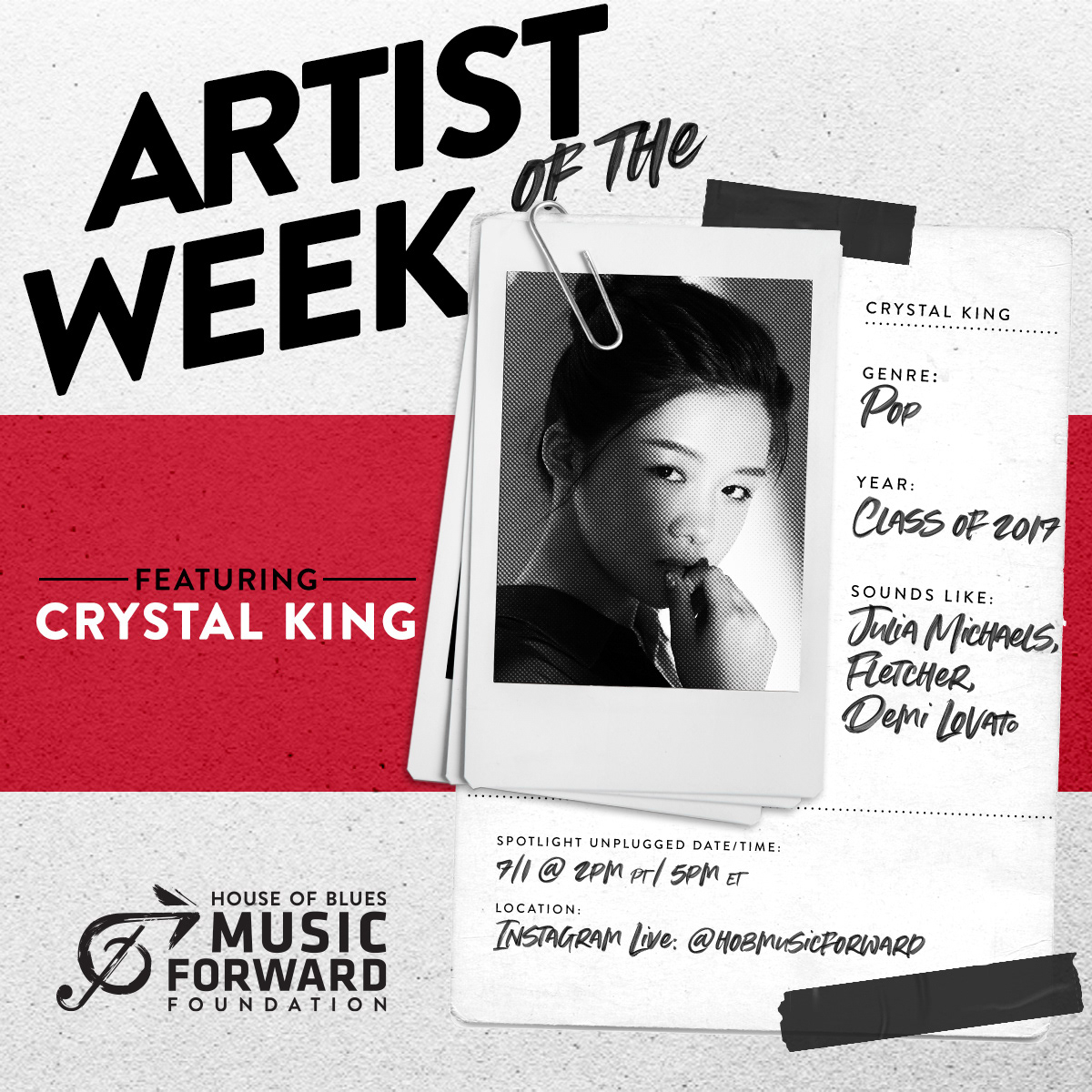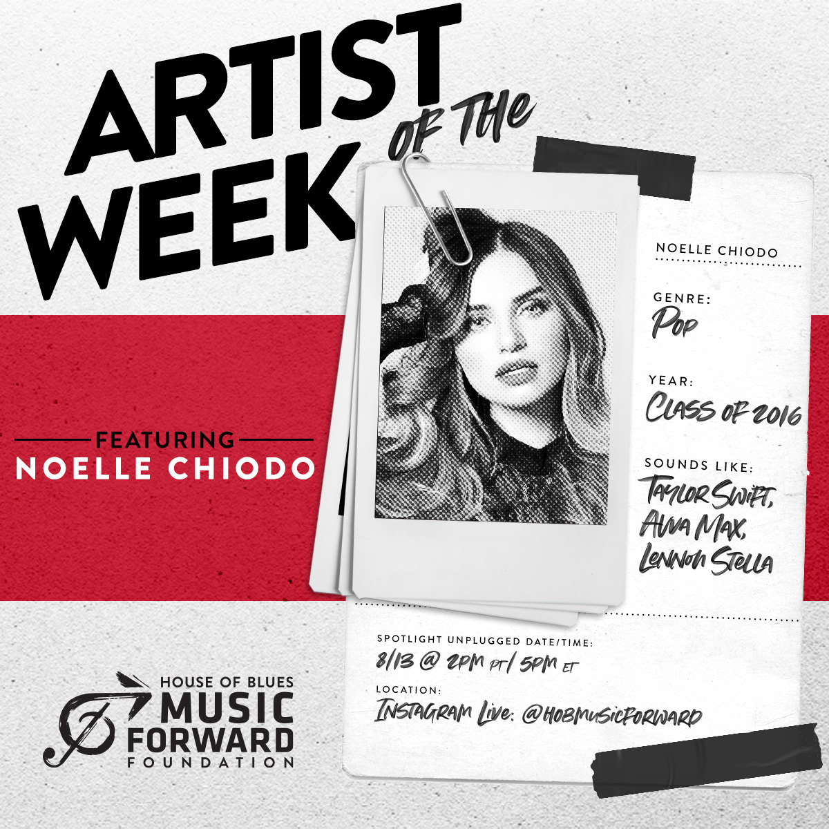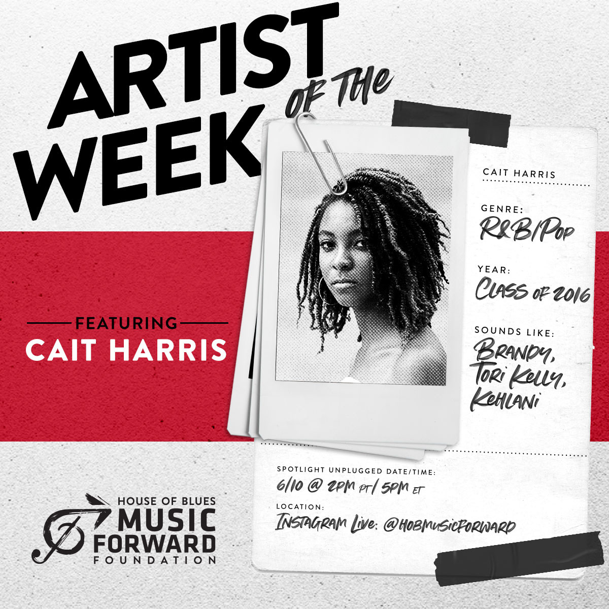 Social graphic template design for nonprofit House of Blues Music Forward Foundation's Artist of the Week program, highlighting up and coming youth artists.