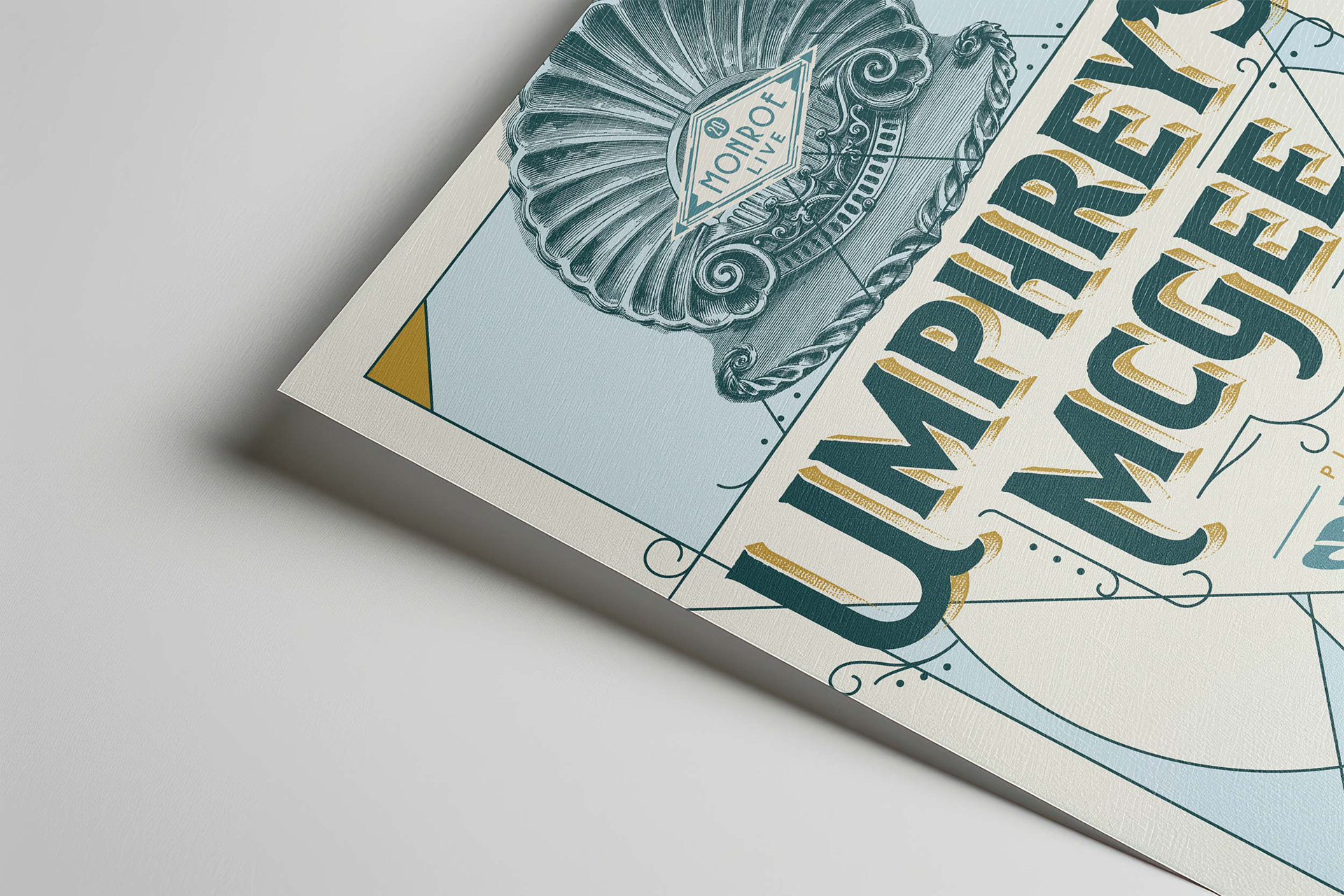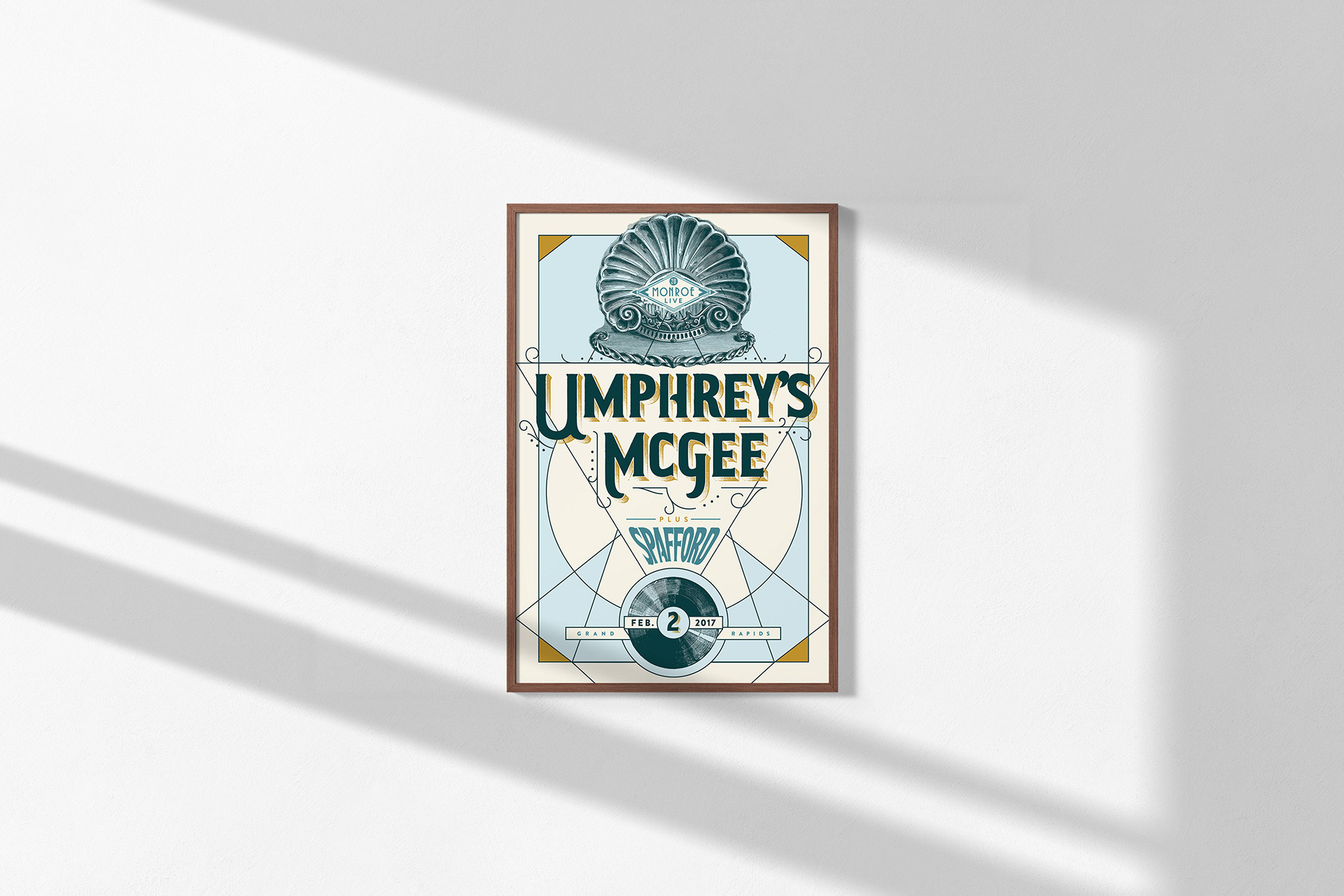 Commemorative gig poster for Umphrey's McGee as part of 20 Monroe Live's grand opening concert lineup.