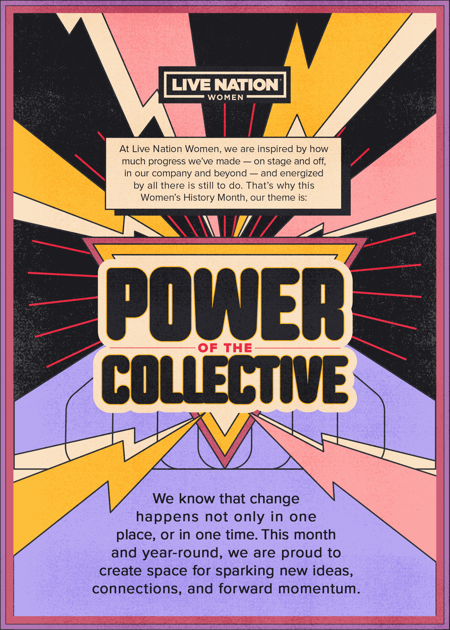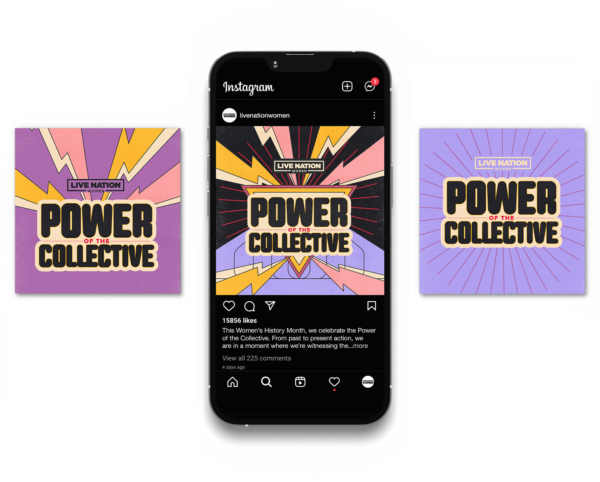 Branding of Womens History Month: Power of the Collective, for Live Nation Women. Social campaign and conference for women in the music industry, including social, keynote, and zoom panel graphics.